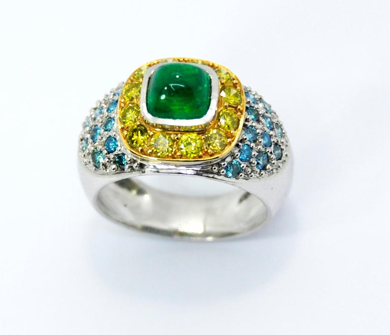 Cabouchon Emerald In A Tray Of Blue And Yellow Diamonds In A 18 Karat White Ring