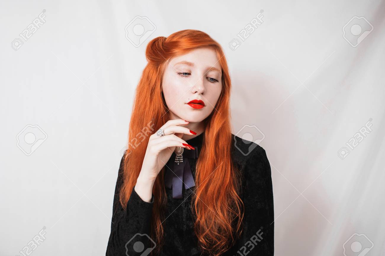Woman With Red Straight Hair Wearing A Black Dress On A White
