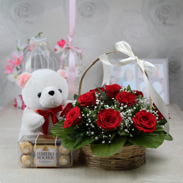 Basket Arrangement Of 10 Red Roses With Teddy 16 Pcs Ferrero Rocher