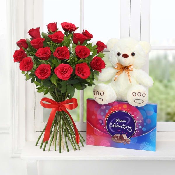 Bouquet Of 18 Red Roses With Teddy Cadbury Celebrations Box